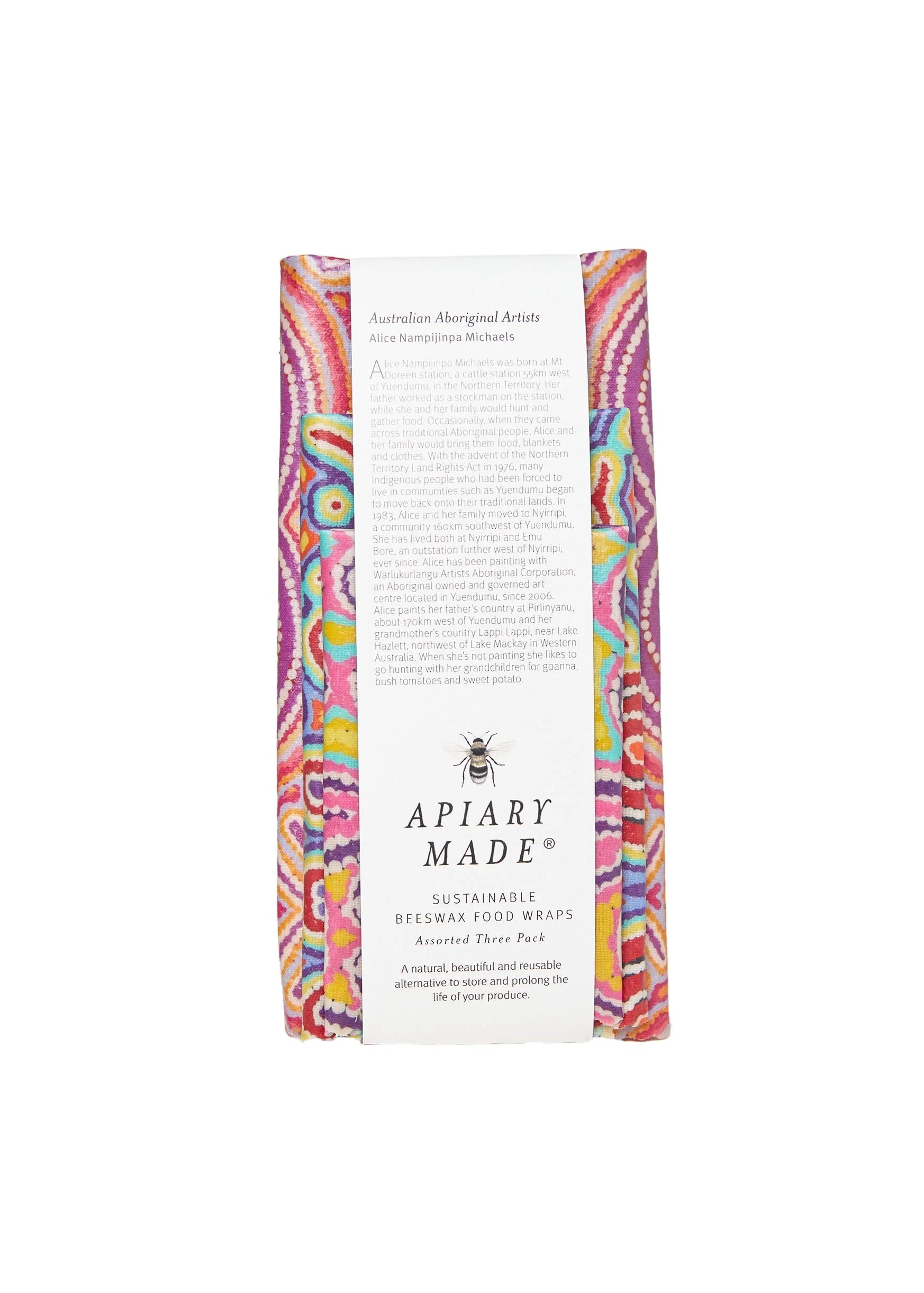 Sustainability meets art with this special pack of Beeswax Food Wraps created in collaboration with the Warlukurlangu Artists Aboriginal Corporation. Featuring three paintings by Artist Alice Nampijinpa Michaels.