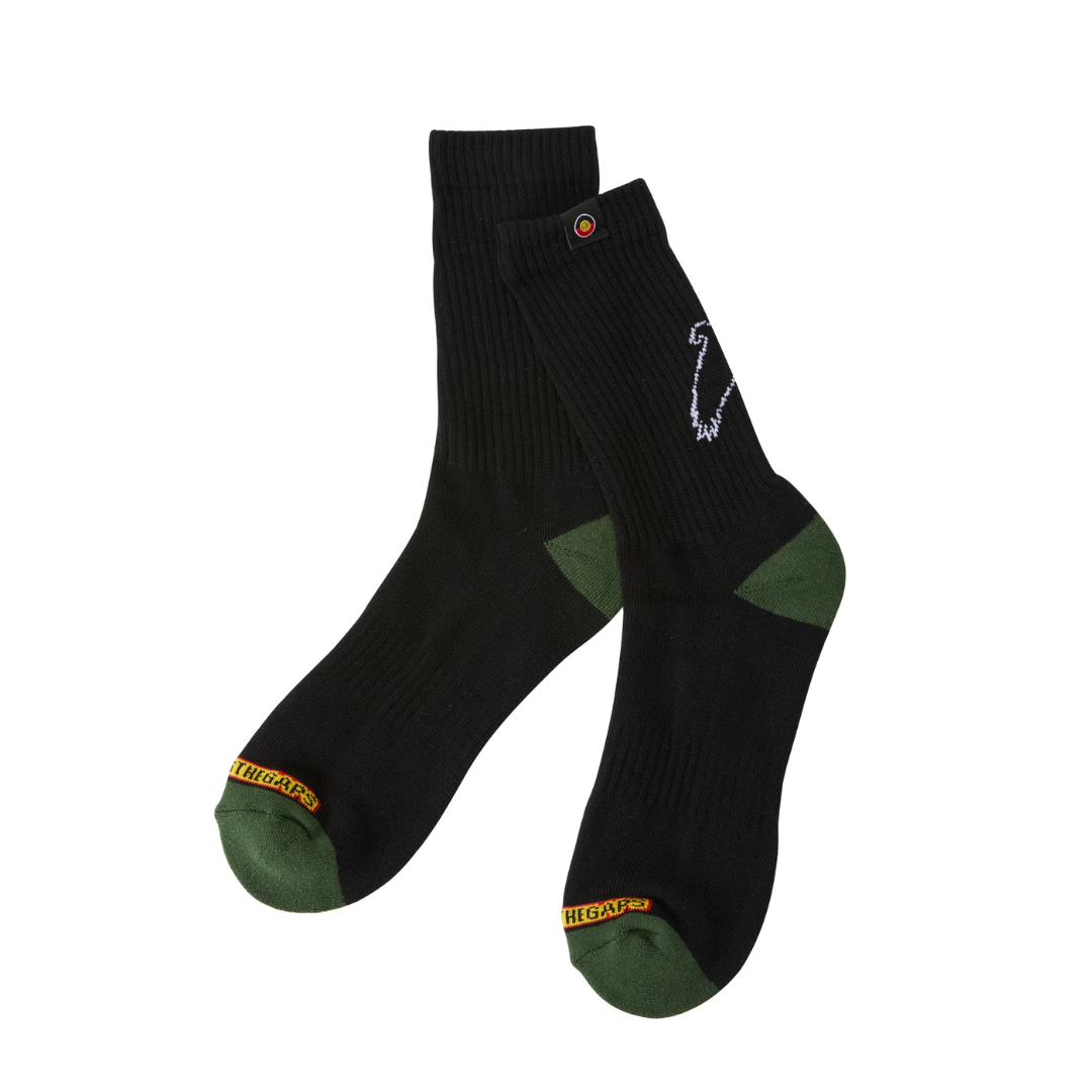 These black socks with pops of forest green feature Bunjil, a well-known wedge tailed eagle who is the spiritual creator and protector of the Kulin Nation in Victoria.